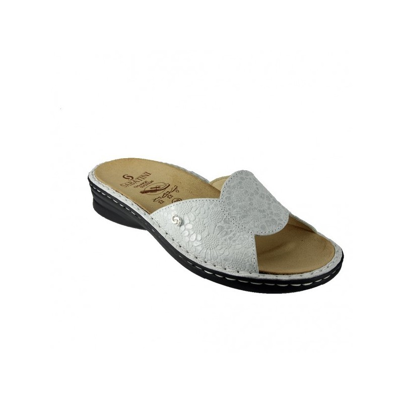 Calzatura con ununica fascia in pelle, recante il simbolo del marchio Sabatini. Realizzata coin una fantasia particolare, estiva e sbarazzina. Plantare estraibile con la possibilità di mettere quello ortopedico. Altezza del tacco ortopedica 3,5 Cm. Cuciture fatte a mano, lavorazione artigianale. Suola antiscivolo. Massima praticità e qualità ad un prezzo contenuto.