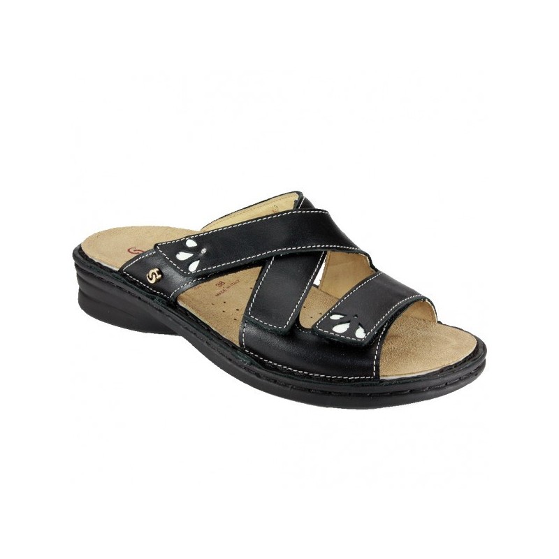 Calzatura comoda dalla linea più classica. La salute e il benessere del piede oltre ad un'ampia regolazione sono garantiti dalle tre fasce a strappo. Massima praticità di una calzatura per mille usi. Materiali italiani di prima qualita, morbidi e massiomo comfort. Plantare estraibile con possibilità di alloggiare il proprio ortopedico. Nuovo plantare in lattice, molto morbido con la caratteristica di ammortizzare il peso del corpo riducendo il carico sulle articolazioni oltre che estraibile per alloggiare quello ortopedico su misura. Tacco 3.5 cm circa. Cuciture fatte a mano, lavorazione artigianale. Suola antiscivolo.