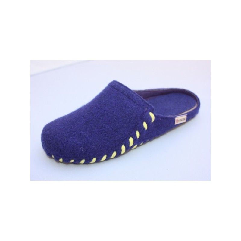 Calzatura da camera confortevole in lana cotta, realizzata con materiali di qualità e caratterizzata dall'avere un'unica cucitura realizzata a mano. Plantarino estraibile, disponibile nei colori Blu e Ametista.