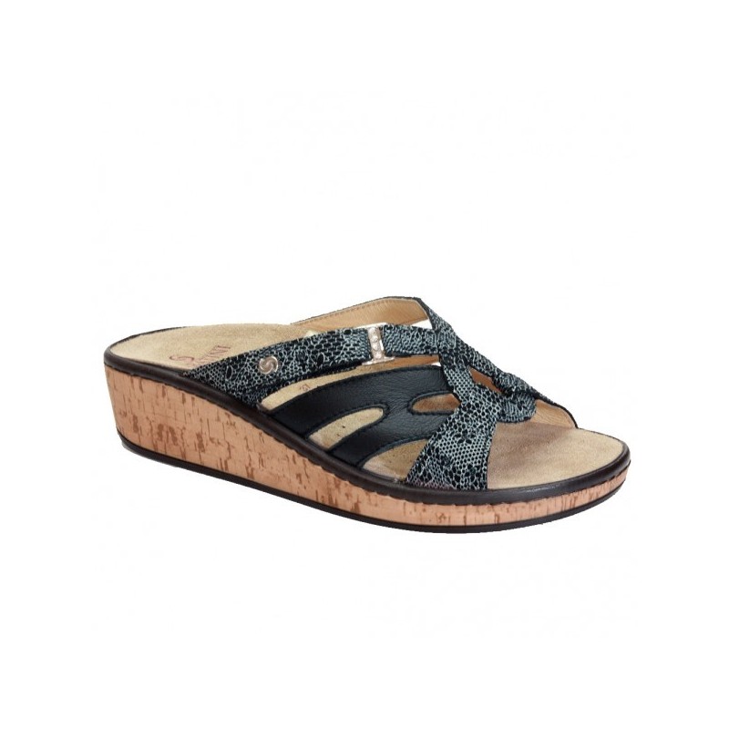 Calzatura caratterizzata da uno stile nuovo, giovane ed originale. Articolo che fa parte di una nuova linea con fondo in poliuretano effetto sughero. Plantare in lattice morbidissimo e tomaia dai colori e pellami innovativi. Massima attenzione per i dettagli. La comodità che si lega con l'estetica. Piccola regolazione su un lato grazie allo strappo in velcro. Fondo in gomma antiscivolo. Plantare estraibile.