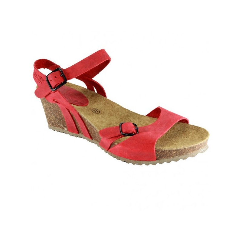 2400 Raja Rosso - Sandalo con zeppa più alta sottopiede morbido e tomaia lavorata in pelle. Sbarazzino ed originale, Fibia regolabile alla caviglia e sulla punta. Articolo giovane dalla tomaia leggera e fondo in micro. Grande cura ed attenzione al particolare. Pellami dermocompatibili, Italiani di prima qualità, colorati e giovanili. Altezza della zeppa circa 5 cm.